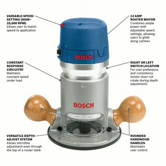 This Mid-Size Fixed and Plunge Base Router delivers powerful performance, precision, and versatility for professional woodworking. With a 2.25 hp motor, variable speed up to 25,000 RPM, and support for 1/4 in, 3/8 in, and 1/2 in collets, it provides smooth, accurate cuts for both fixed and plunge routing tasks....