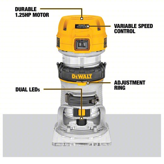 This router stands out for its power-to-size ratio and precision engineering. The 1.25 hp motor provides consistent performance across variable speeds, while the soft-start feature minimizes torque on startup for better control. Its dual LED lights improve visibility, and the aluminum housing ensures durability without adding weight. The ergonomic palm grip design enhances comfort, making it easy to handle for extended periods.